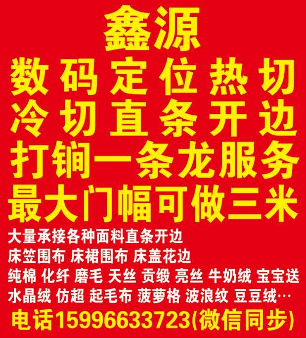 数码定位热切 冷切直条开边 打锏一条龙服务 大量承接各种面料可开三米门幅 ...